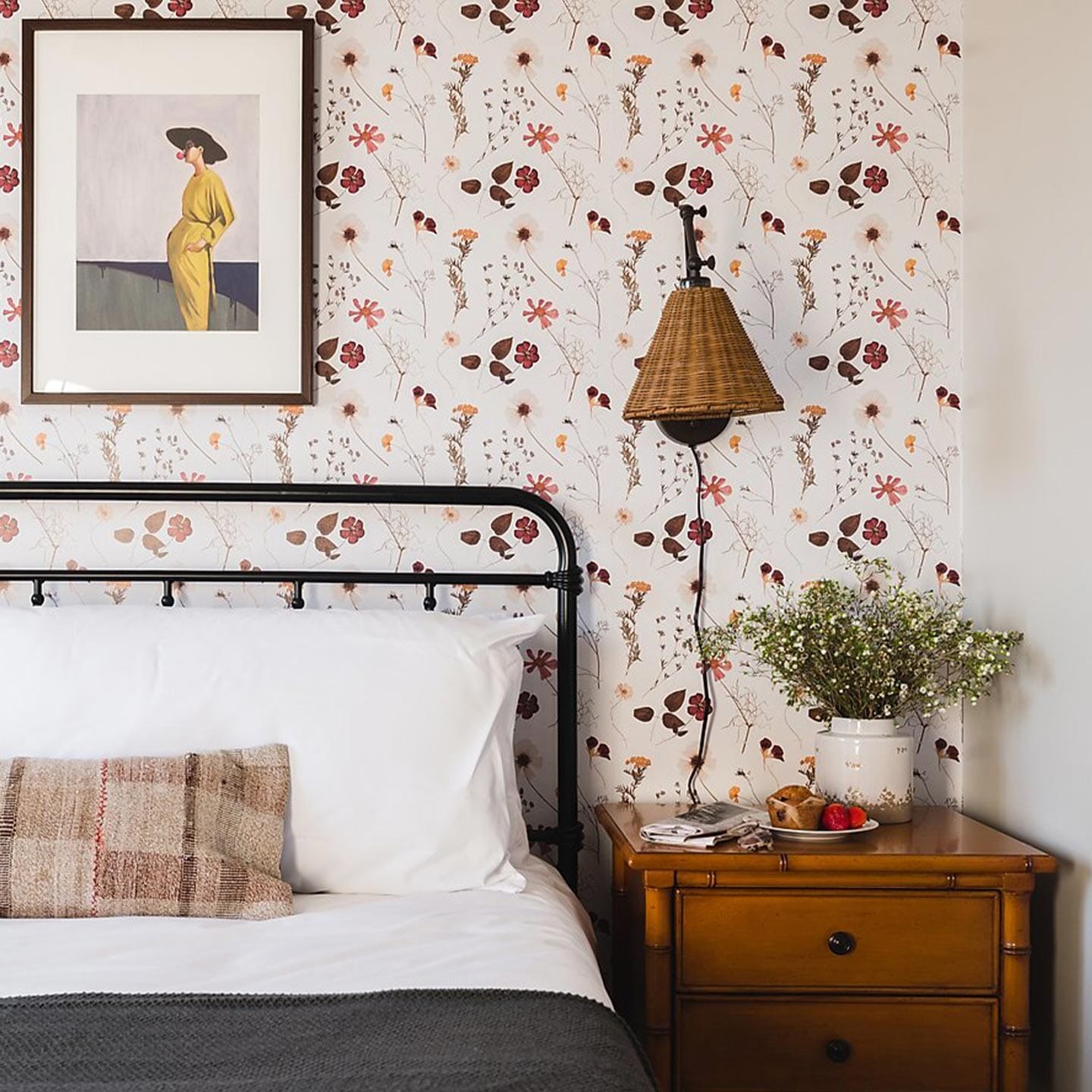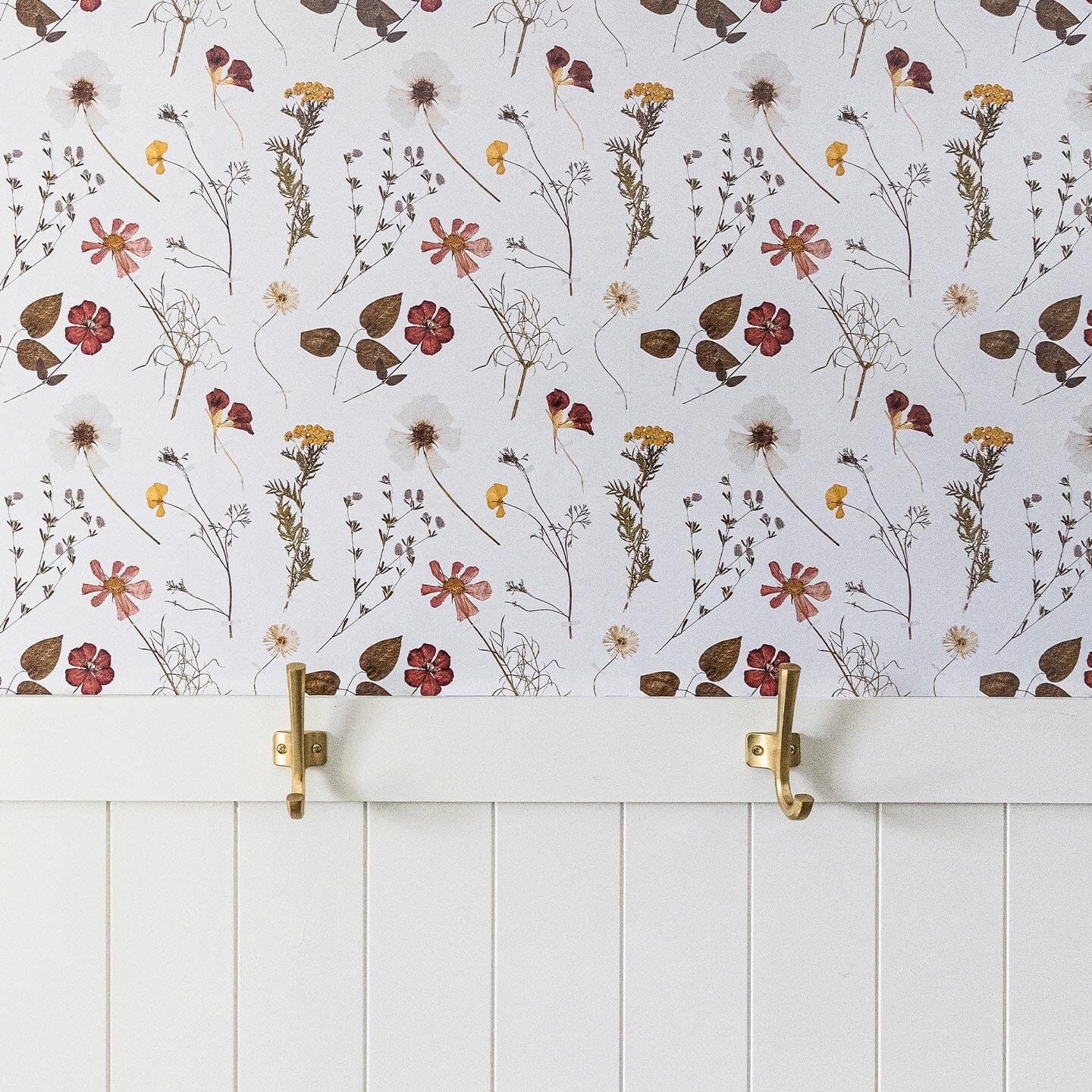 Photographed woodland forget me not's, bellflowers, violas, goldenrod, zinnias, and buttercups dance across our Diary of Flowers Wallpaper in a whimsical pattern. In muted shades of burgundy, cream, and mustard, each bloom and leaf appears recently pressed for preservation.